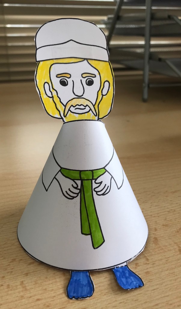 After this, we did some craft. The children were given the shapes needed to make Zechariah, in a cone shape, complete with turban and feet.